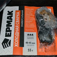 Так вот, купил на днях клей-пластилин ЕРМАК. Упакован он в пластиковую тубу, на которой красуется надпись «Холодная сварка». Внутри находится небольшая «колбаска» обернутая целлофаном, коротенькая инструкция с расписанными техническими характеристиками.