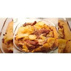 Необходимо смазать противень растительным маслом. Затем выложить на него картофель, не более двух-трёх слоёв. Сверху распределить мясо, а пустоты между ними заполнить оставшимся картофелем. После этого смазать всё маринадом.