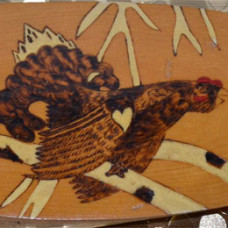 Если внимательно приглядеться, то создается ощущение, что помимо красок и толстого слоя лака, который от времени покрылся мелкой паутиной трещинок, применялось и выжигание: у контуров и сидящего на ветке тетерева. Радует ещё одна мелкая деталь, что дерево на картинке и сам спил стилизован под березу (а возможно оно и есть). Подумать только, прошло более 40 лет, но намека на плесень, трещины или искривления у него нет.